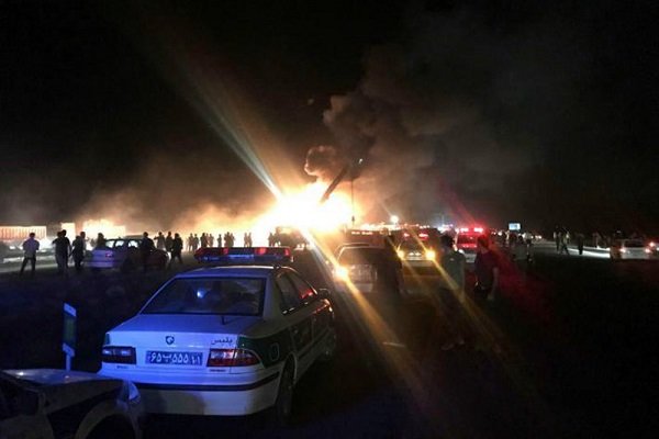 The accident happened in Kashan-Natanz freeway at 11:30 PM local time on Monday. The bus had departed Tehran for Kerman while it collided with the tanker truck and overturned on the sideline of the road, catching fire.