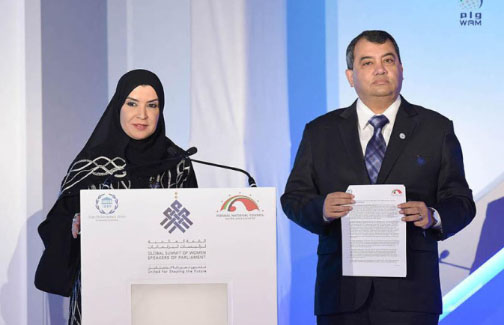 Below is the full text of the Declaration: "We, women Speakers of Parliament from more than 30 countries, met on 12 and 13 December 2016 in Abu Dhabi, United Arab Emirates, for the Global Summit of Women Speakers of Parliament, organized by the Inter-Parliamentary Union (IPU) and the UAE Federal National Council for the purpose of shaping the future of parliaments for a better world.