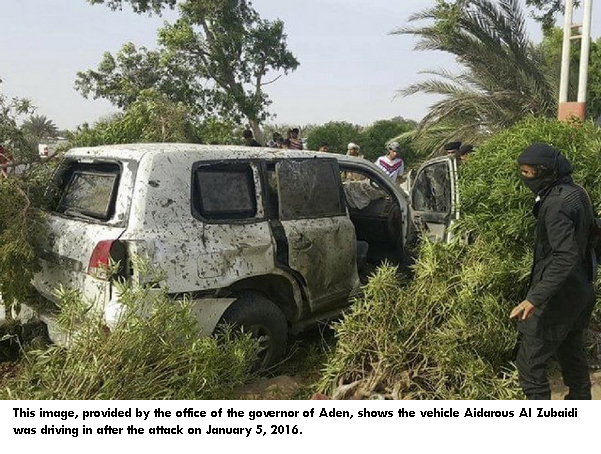 ADEN, 6th January 2016 (WAM)--- The governor of Aden, Aidarous Al Zubaidi and the governor of Lahij, Nasser Al Khabji, have survived a car bomb attack targeting his convoy in al-Enma' residential district, the state Yemen News Agency reported Tuesday. The incident comes days after the Aden security authorities imposed a dusk-to-dawn curfew in the city following gun battles between militants and government security forces at the seaport. The two governors were accompanied by Chief of Security of Aden, Brigadier Shallal Shaea', when terrorists attacked their convoy, a local official security source told the agency. The attack killed two bodyguards and left seven others injured. The source said the three officials were not hurt in the attack. On Sunday, the security commission of Aden Governorate imposed a curfew from 8pm to 5am on Aden City after militants laid siege to the seaport in Mualla district in a bid to force out the government security forces. The curfew came into force yesterday Monday. – Emirates News Agency, WAM - http://www.wam.ae/en/news/emirates/1395289969801.html