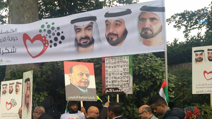 LONDON, 6th October 2015 (WAM) --- Hundreds of members of the Yemeni community in the UK have rallied at the Embassy of the United Arab Emirates to show support for the Kingdom of Saudi Arabia and the United Arab Emirates and the Saudi-led Arab coalition undertaking operations to restore legitimacy to their country. The Yemeni demonstrators waved the flags of the United Arab Emirates and Saudi Arabia, held up placards bearing pictures of the leaders of the United Arab Emirates and the Kingdom of Saudi Arabia and shouted slogans against the rebel Houthi group and militia loyal to the ousted president Ali Abdullah Saleh for wreaking havoc on Yemen and carrying out terrorist, murderous and destructive acts against the Yemeni people. Firas Al Yafea, head of two pro-coalition campaigns to thank the two Gulf countries, and editor-in-chief of Yemeni media organisation Al Hakika Press, stressed that their efforts to liberate Aden from the rebel militia will always be remembered by the Yemeni people. He added that the demonstration shows gratitude to the Custodian of the Two Holy Mosques, King Salman bin Abdulaziz Al Saud of Saudi Arabia, and President His Highness Sheikh Khalifa bin Zayed Al Nahyan of the United Arab Emirates for their efforts to save Yemen from the terrorism being perpetrated by the Houthis and their ally, former president Saleh. Fawaz Hanbala, co-ordinator of the campaign supporting the United Arab Emirates, said the demonstrators took to street to thank all those who conducted Operation Decisive Storm that saved Yemen from the brutal, flagrant and wrongful aggression. Abdul Rehman Al Mutaiwee, Ambassador of the United Arab Emirates to the UK, received members of the #ThankYouUAE campaign. – Emirates News Agency, WAM -http://www.wam.ae/en/news/emirates/1395286358227.html