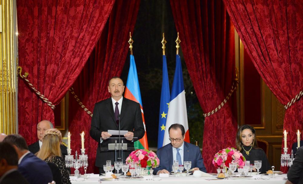 President of the French Republic Francois Hollande hosted a dinner party for President of the Republic of Azerbaijan Ilham Aliyev and first lady Mehriban Aliyeva.