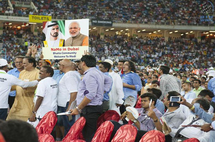 DUBAI, 18th August, 2015 (WAM)--Indian Prime Minister Narendra Modi, has hailed the role of Indian expatriates in the development of both the UAE and India, citing that some expatriates laboured, with some for 10, and others for 20 to 30 years, earning their living but at the same time making India proud of them. Addressing the Indian expatriates yesterday at the Cricket Stadium in Dubai, he said, "Because of your talent, discipline, always India will always be proud of you." He recalled when AB Vajpayee was the PM, India conducted the nuclear test. "The world was astonished. Some were bitter and enmity mushroomed and sanctions were put. Economic problems erupted." Modi noted that Vajpayee asked Indians across the world to help and today "I am proud to say that Indians in the Gulf contributed the most filling the coffers then." Referring to cosmopolitan status of Dubai, he said, "People from all over the world have found a home in Dubai. Even people from the colder chimes stay in temperatures that hover in the range of 45-50 degrees. Dubai attracts talent from all over the world." He noted that there are more than 700 flights every week from India to the UAE. "In the world, there is no such aviation agreement like we have here. Every week, more than 700 flights arrive here." Modi commended the reception accorded to him by His Highness Sheikh Mohamed bin Zayed Al Nahyan, Crown Prince and Deputy Supreme Commander of the UAE Armed Forces and H.H. Sheikh Hamdan bin Mohammed bin Rashid Al Maktoum, Crown Prince of Dubai. He noted that "Sheikh Mohamed bin Zayed received me at the airport with all his five brothers. This warmth, love and respect will be remembered. This love, respect, is not for a person. This is a respect for 1.25 billion people, respect for the changed image of the country." Modi thanked Sheikh Mohamed bin Zayed for his kind gesture to grant a land for the construction of a temple. "People can understand the significance of this move. This is a big gift". The remark received an applause for the Crown Prince Abu Dhabi." He also thanked Members of Supreme Council and Their Highnesses, Rulers of Emirates. "I am thankful to the Rulers. In these two days, there is a confidence in the air, international relations are based on how articulate you are, on diplomacy, and more than this trust is above all." In international relations, Modi continued, "trust is a big factor. In such a few hours, I can say that India and UAE are bridges of truth and we should have a foundation that is known for generations." "I am happy that today India and the UAE issued a joint statement. Sheikh Mohamed bin Zayed has pledged to invest 4.5 lakh crore in India," he added. He referred to the UAE and India's resolve to fight the terrorism. "Today the world is seeing India in a new light. The reason for this change is not Modi, but the change is because of the determination and will of 1.25 billion people," Modi said. He added, they see an economy that is growing at a fast pace. IMF, World Bank, the whole world rating institutions have said in unison that India is developing at a fast pace among large economies. – Emirates News Agency, WAM - http://www.wam.ae/en/news/emirates/1395284436088.html
