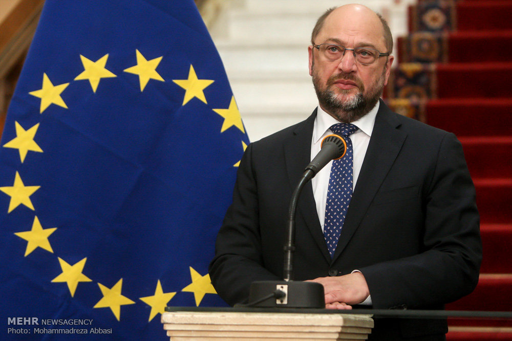 President of the EU Parliament Martin Schulz who arrived in the Iranian capital on Saturday, attended a joint press conference with Parliament Speaker Ali Larijani following their bilateral meeting to promote ties between Iran and the European Union.
