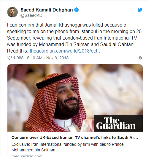 In a tweet on Friday, Saeed Kamali Dehghan said "I can confirm that Jamal Khashoggi was killed because of speaking to me on the phone from Istanbul in the morning on 26 September, revealing that London-based Iran International TV was funded by Mohammad Bin Salman and Saud al-Qahtani."