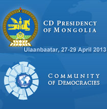 Mongolia to Host High-Level Meeting of the Community of Democracies ULAANBAATAR, 18 April. In what will be the biggest multi-lateral gathering ever to be held in Mongolia, the 7th Ministerial Conference of the Community of Democracies (CD) will take place in Ulaanbaatar, Mongolia on 29 April. Among the several hundred participants will be President TsakhiaElbegdorjof Mongolia, President Goodluck Jonathan of Nigeria, the Prime Minister of Thailand YingluckShinawatra, forty foreign ministers, as well as Nobel Peace prize winners Aung San SuuKyi of Myanmar and Tawakkol Karman of Yemen. The Community of Democraciesis a global intergovernmental coalition of democratic countries, with the goal of promoting democratic rules and strengthening democratic norms and institutions around the world.The first meeting of the Community, which was initiated by the United States and Poland, took place in Warsaw in June 2000. At the conclusion of that meeting, senior officials from 106 countries signed a declaration entitled Toward a Community of Democracies which is still today considered the most comprehensive international declaration on democratic values. The vision of the Community of Democracies is to serve as a global platform for democratic countriesthat, together with civil society, parliamentarians and the private sector, seek to strengthen democracy both at the national level and internationally. Its mission is to support democratic transition and consolidation worldwide and help bridge the gap between principles and practice of democracy and human rights. Ministerial meetings of the Community of Democracies are held every two years. This 7th session is expected to focus on how to advance democratic reforms in CD member states, especially in emerging democracies and those facing challenges. Thematic discussions will be held on: democracy education; corruption; the Arab Spring; democracy and the Millennium Development Goals; as well as on-line and press freedom. A high-level discussion will be held on threats against civil society and freedom of expression. The Ministerial meeting will be preceded on 27 and 28 April by meetings of the CD's five pillars: civil society, women, youth, parliamentarians' and the corporate sector. More information on the CD and the 7" Ministerial Conference in Ulaanbaatar as well as information on media accreditation can be found at www.cdmongolia.mn. Information on the CD and its activities can be found at www.community-democracies.org. For press enquires please contact: Mr. Dashnyam Enkhtaivan, Head of Press and Public Relations Division, Ministry of Foreign Affairs of Mongolia E-mail: enkhtaivan@mfat.gov.inn. media@cdmongolia.mn