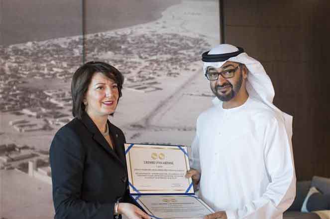 In her remarks as she presented His Highness Sheikh Mohamed bin Zayed with the honour, President Jahjaga said, "In tribute to the friendship between our countries and in gratitude and deep appreciation for the helping hand that you have given to Kosovo, to its renewal, to giving life to the hope of its people to become masters of their own fate and to build their own state. We cherish the commitment of the United Arab Emirates and His Highness, the Crown Prince of Abu Dhabi Sheikh Mohammed Bin Zayed al Nahyan to peace and welfare in the Republic of Kosovo.
