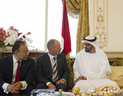 Abu Dhabi: His Highness General Sheikh Mohamed bin Zayed Al Nahyan, Crown Prince of Abu Dhabi and Deputy Supreme Commander of the UAE Armed Forces received this evening at Al Bahr Palace Campbell Newman, Premier of the Australian State of Queensland who is heading a state delegation on a visit to the UAE.