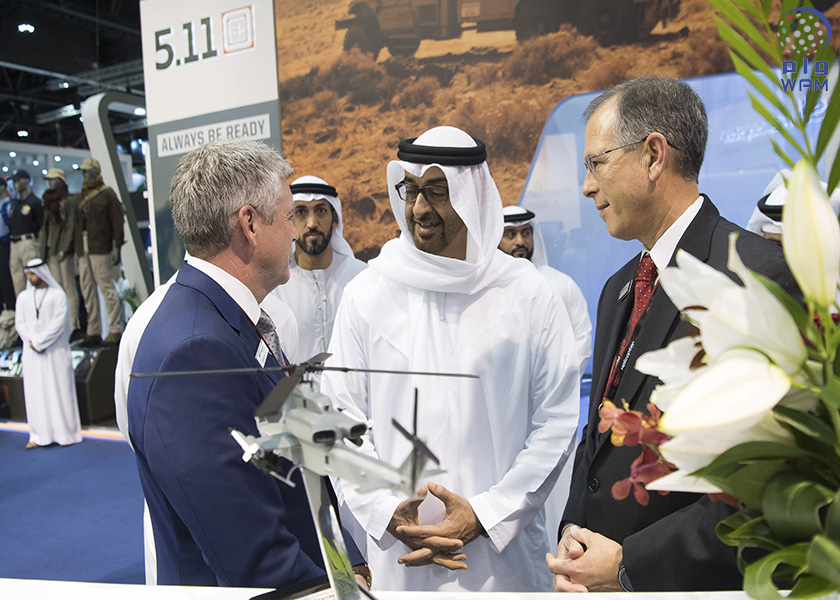 His Highness Sheikh Mohamed bin Zayed Al Nahyan then visited the exhibition by Bell Helicopters, a US company that specialises in manufacturing helicopters. The representative of the company presented an explanation of the most important standards and systems of the company to His Highness Sheikh Mohamed bin Zayed Al Nahyan.