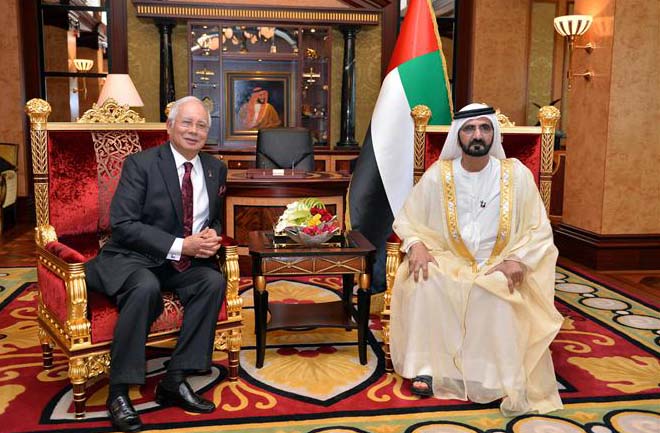 Dubai (WAM): Vice President and Prime Minister and Ruler of Dubai His Highness Sheikh Mohammed bin Rashid Al Maktoum, on Thursday at the Za'beel Palace, received Prime Minister of Malaysia, Mohammad Najib Tun Haji Abdul Razak, and the delegation accompanying him on his visit to UAE During their meeting which was attended by H.H. Sheikh Hamdan bin Mohammed bin Rashid Al Maktoum, Crown Prince of Dubai, and H.H. Sheikh Maktoum bin Mohammed bin Rashid Al Maktoum, Deputy Ruler of Dubai, H.H. Sheikh Mohammed bin Rashid and prime minister Najib Razak had exchanges on a number of economic matters of common interest. The two sides also stressed on the importance of strengthening the UAE-Malaysian bilateral relations, in particular in trade exchange and the building of economic partnerships that are in mutually beneficial for their peoples. The Malaysian prime minister expressed his confidence that his current visit to UAE will contribute to finding new avenues for wider cooperation and building tourism and cultural bridges, alongside economic cooperation between the two countries. Mr. Razak expressed his congratulations to H.H. Sheikh Mohammed bin Rashid and UAE leadership for winning the bid to host World Expo 2020. He termed the win as well-deserved as UAE is a gateway between the East and the West and a hub for the world's cultures with outstanding civilisation and hospitality. – Emirates News Agency, WAM