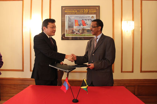 Ulaanbaatar, Mongolia /MONTSAME/ The permanent representative of Mongolia to the United Nations, Mr O.Och and the permanent representative of Jamaica to the United Nations, Mr Raymond Osbourne Wolfe signed a joint official communique establishing the diplomatic ties between Mongolia and Jamaica.