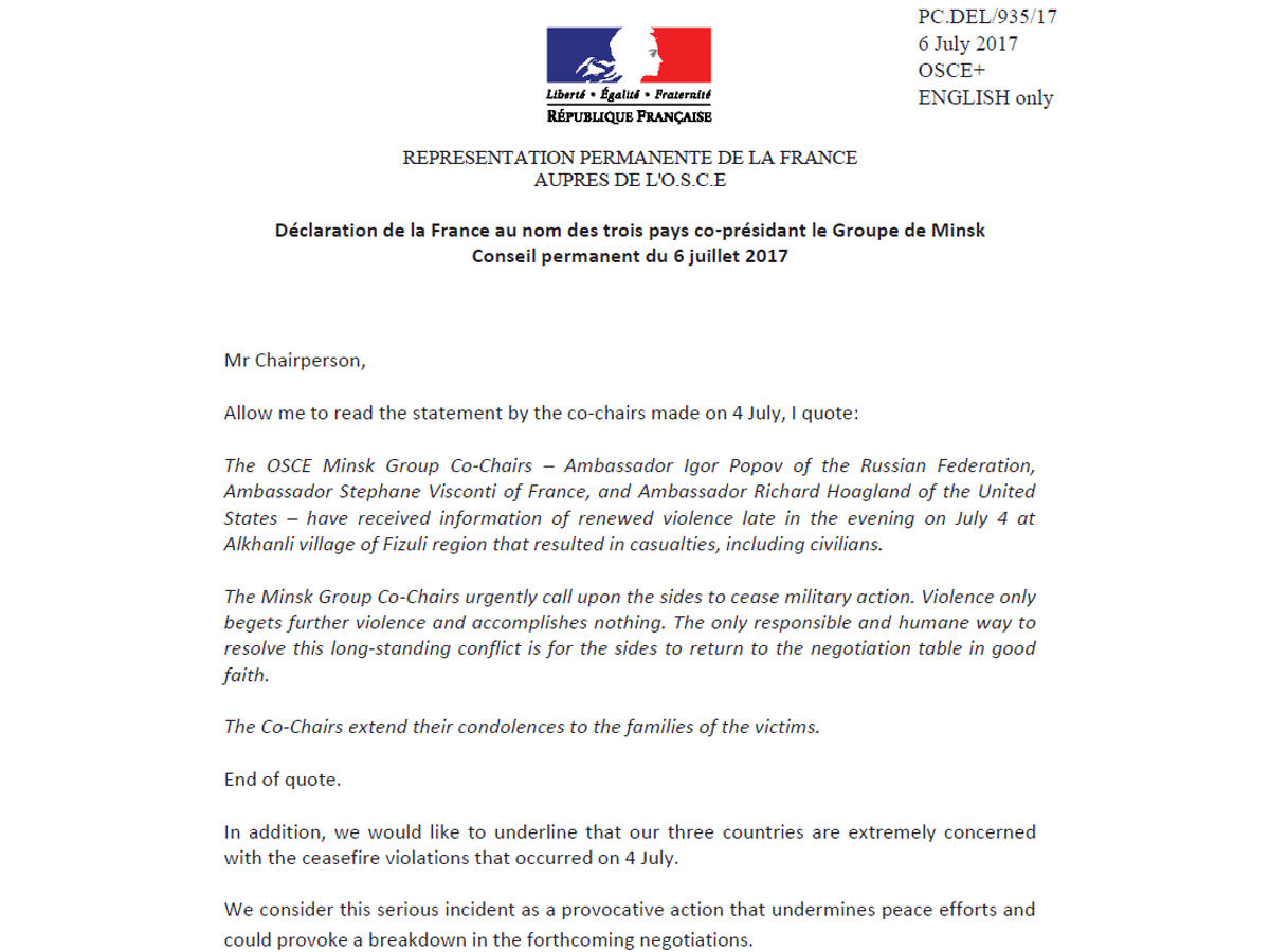 OSCE MG co-chairs regard Armenia’s actions in Alkhanli as provocation - statement