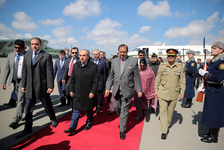 Pakistani president and his spouse Begum Sahiba were welcomed by first Deputy Prime Minister of Azerbaijan Yaqub Eyyubov and other officials.