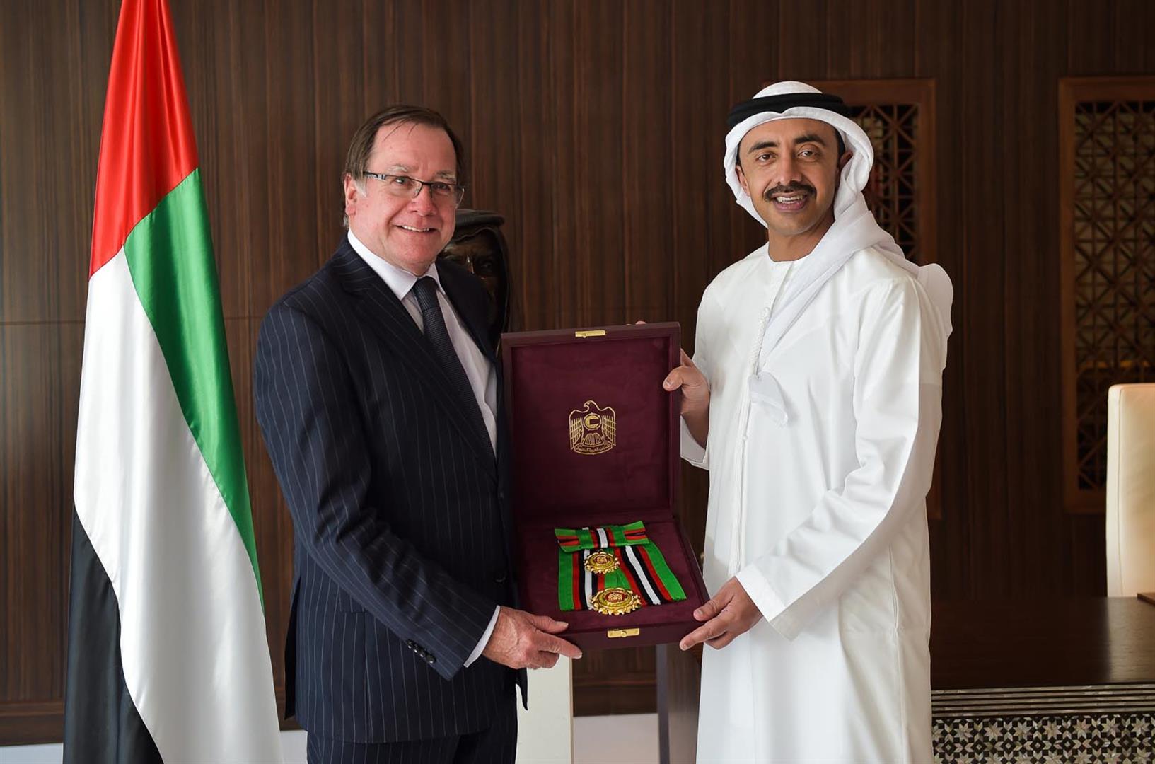 H.H. Sheikh Abdullah bin Zayed Al Nahyan, Minister of Foreign Affairs and International Cooperation, decorated McCully with the Order during a meeting at the ministry in Abu Dhabi on Monday.