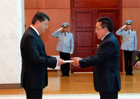 Ulaanbaatar, Mongolia /MONTSAME/ The President Ts.Elbegdorj received the credentials from the newly appointed Ambassador Extraordinary and Plenipotentiary of the Republic of Turkey to Mongolia Mr. Mustafa Sarnic on Tuesday.
