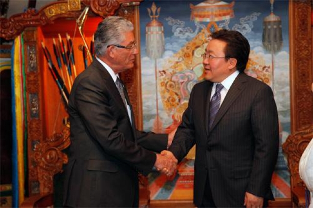 Ulaanbaatar /MONTSAME/ The President of Mongolia Ts.Elbegdorj received Mr Alfio Piva Mesen, the first Vice-president of Costa Rica on April 27. The Mongolian leader thanked Mr Piva Mesen for coming to the CoD's seventh Ministerial conference. He recalled how he had met with Costa Rica's President at Davos meeting last January and wished Mr Piva Mesen a nice stay in Mongolia. It is an honor to take part in the conference in Mongolia, Mr Piva said and extended warm greetings to the Mongolians and congratulated them on running such an event. He said his country highly speaks all activities Mongolia has been undertaking to strengthen the CoD and improve its structure. It is a historical event that the Costa Rican delegation arrived first ever time in Mongolia headed by the Vice president, he said. The current visit is to draw the two nations closer to each other, he stressed. Mr Piva Mesen said his country can share its experience in tourism with Mongolia. Costa Rica pays great attention to the green development and eco-tourism, for example, in the last year 1,5 million tourists were received, he noted and said he intends to meet the Mongolian Minister of tourism to share some ideas. He also said our two countries have same opinions about the contemporary democracy. The Mongolian President said "it is a historical visit indeed" and expressed a confidence that it will leave its traces in our relationship. We should work closer, the Mongolians should learn the Costa Rican expertise in tourism, besides, there are many works the two sides can do supporting each other in the international arena, he said and appreciated Costa Rica's achievements. Mr Elbegdorj said Mongolia will pass the CoD chairmanship to El Salvador and expressed a confidence that this Latin country will continue the works Mongolia has executed within two years. D.Enkhbileg