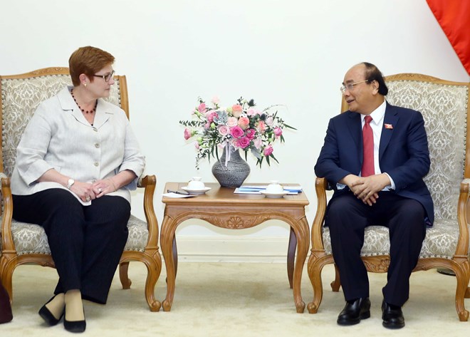 Hanoi, June 14 (VNA) – Prime Minister Nguyen Xuan Phuc hosted a reception for visiting Australian Minister of Foreign Affairs Marise Payne in Hanoi on June 13. PM Phuc congratulated Payne on her reappointment as Minister for Foreign Affairs cum Minister for Women of Australia. The PM spoke highly of Payne’s role in and significant contributions to promoting the Vietnam-Australia strategic partnership over the past years in both positions as the Minister for Foreign Affairs at present and the Minister for Defence in the past. He welcomed Payne for selecting Vietnam as one of the first countries to visit right in the second week of her new working tenure. Relations between Vietnam and Australia have been developing fruitfully in the recent past, PM Phuc said, adding that Australia has annually trained nearly 30,000 Vietnamese students. Two-way trade reached 7.7 billion USD in 2018, a year-on-year rise of 19.3 percent. Australia currently ranks 19th among 128 foreign investors in Vietnam with total investment of over 1.84 billion USD, while Vietnam is running 47 direct investment projects in Australia. Besides economic ties, the potential for bilateral cooperation in other realms remains large, PM Phuc said. He asked the two sides to review the implementation of the Vietnam-Australia action programme for 2016-2019 and begin the building of an action programme to realise the bilateral strategic partnership in the next period with special measures and goals to further deepen the bilateral cooperation in all fields. The PM suggested the two sides effectively uphold the current bilateral cooperation mechanisms, especially the annual coordination mechanisms at the ministerial level. Vietnam and Australia should increase trade and investment ties while stepping up cooperation in other important spheres such as education, training, culture, tourism, sports and people-to-people exchanges, creating a firm foundation for the expansion and enhancement of comprehensive cooperation at the central and local levels, he recommended. PM hoped Australia will continue providing official development assistance (ODA) for Vietnam and assisting the Southeast Asian country to improve the administration capacity and experience in managing the economy amidst the Fourth Industrial Revolution and e-government. The PM extolled the effective cooperation and coordination between Vietnam and Australia at regional and international forums, especially the United Nations (UN), ASEAN-Australia partnership and expanded ASEAN mechanisms, Asia-Pacific Economic Cooperation (APEC) Forum, Asia-Europe Meeting (ASEM), and Comprehensive and Progressive Agreement for Trans-Pacific Partnership (CPTPP). He hoped Australia will continue supporting and coordinating closely with Vietnam when the country takes over the role as a non-permanent member of the UN Security Council for the 2020-2021 term and chairmanship of the Association of Southeast Asian Nations (ASEAN) in 2020, including the organisation of the ASEAN-Australia Summit in 2020. Regarding the East Sea issue, PM Phuc clearly stated that Vietnam highly appreciated Australia’s viewpoint and hoped Australia will continue to have a strong voice and back the stance of ASEAN and Vietnam with the spirit of peace, friendship, freedom of aviation and navigation, and compliance with international law. Payne said she will spare no effort to promote the relationship between the two countries, adding that Australian PM Scott Morrison attaches great importance to cooperation with Vietnam and hopes to visit the Southeast Asian country soon. The minister congratulated Vietnam on becoming a non-permanent member of the UN Security Council for the 2020-2021 term, which, she said, shows the increasingly important role of Vietnam in the international arena. She agreed to PM Phuc’s proposal on stepping up bilateral trade and investment ties, saying the CPTPP has opened up many cooperation opportunities and many Australian businesses want to increase investment in Vietnam. The minister said she will direct the Australian foreign ministry to expand new cooperation with Vietnam in the spirit of strategic partnership. Australia is willing to support Vietnam in implementing its development priorities such as infrastructure, digital capacity, and cyber security as well as continue strengthening coordination with Vietnam in the East Sea matter to ensure regional peace, stability and prosperity, she affirmed./.