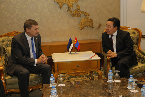 Ulaanbaatar, Mongolia /MONTSAME/ In frames of his participation in the 9th Asia-Europe Meeting (ASEM) Summit, the President Ts.Elbegdorj received on Monday Mr Andrus Ansip, the Prime Minister of Estonia. Within its many-pillar foreign policy Mongolia wants to expand the relations and cooperation with the European Union (EU), including Estonia, the leader of Mongolia said and emphasized an importance of high level mutual visits which will develop the bilateral relations. He is certain that the two sides have experiences to share. The mining sector has been playing a main role in Mongolia's economy, greatly influencing an economic growth of 17.5 percent last year, for example, and there are nice opportunities to boost the cooperation in infrastructure, power stations and roads spheres, the President said. He said some reforms has been made by Mongolia within its chairmanship of the Community of Democracies (CoD), and invited high representatives of Estonia to the 7th Ministerial Conference of the CoD scheduled on July 29 of 2013 in Ulaanbaatar. In turn, Mr Ansip said Estonia has well developed E-governance, communication and IT, for example, over 90 per cent of its banking transactions, income tax declarations and state services run electronically, and said they can collaborate with Mongolia in these sectors. He spoke about Estonia's producing oil from pyroschist, "this oil can be used in power stations and as a petroleum, it is not harmful to environment." Then he expressed willingness to visit Mongolia. The State Head invited the PM to Mongolia, and then proposed widening of the bilateral cooperation in the E-governance and communication. The Estonian President has been invited to Mongolia with a visit, he added. Saying Mongolia intends to introduce the EU standards, the President asked Estonia to cooperate with Mongolia in implementing a partnership and cooperation agreement to be established between Mongolia and the EU, and said Mongolia wants to become a participating state of the Organization for Security and Co-operation in Europe (OSCE). B.Khuder