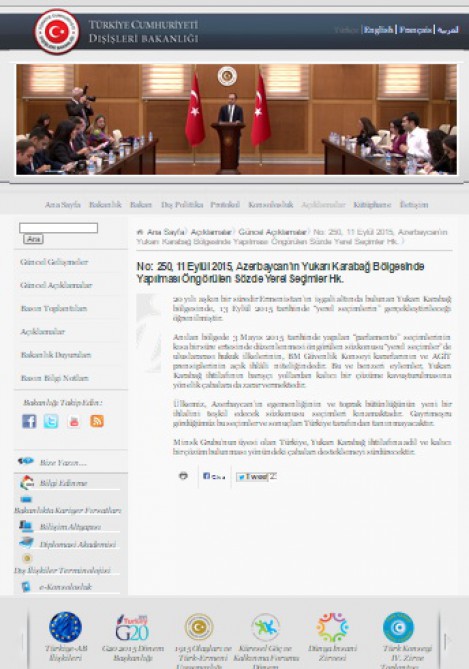 “As the so-called parliamentary elections held in the Nagorno-Karabakh region on May 3, 2015, the forthcoming so-called municipal elections are also in breach of international law, resolutions of the UN Security Council and OSCE principles. Such events harm the efforts aimed at finding a peaceful solution to the Armenian-Azerbaijani Nagorno-Karabakh conflict.”