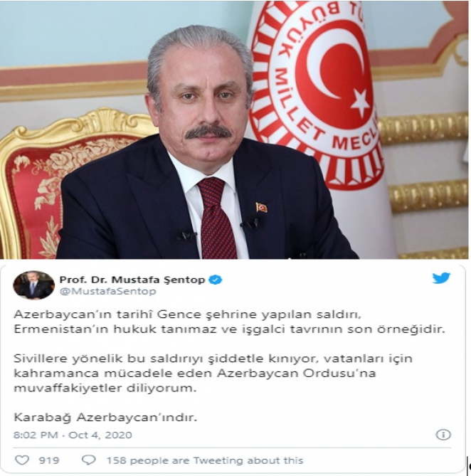 The Turkish parliament's speaker on Sunday condemned Armenia's shelling in Azerbaijan's second largest city of Ganja, according to Anadolu Agency.