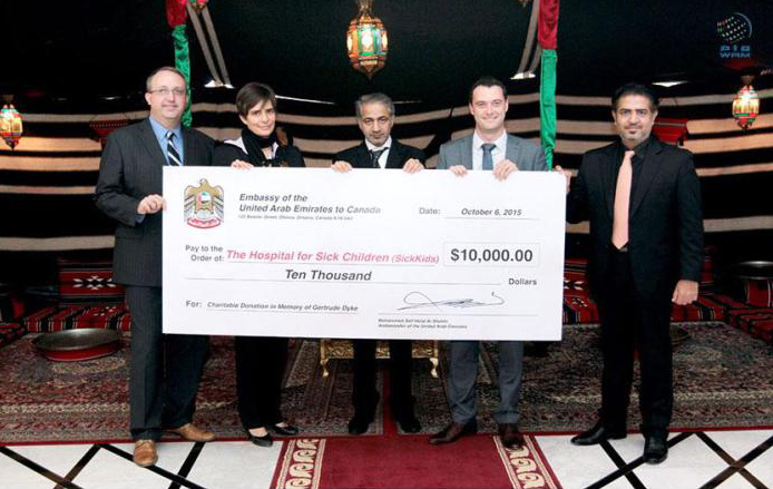 UAE Ambassador to Canada, Mohammed Saif Hilal Al Shehhi, presented, during a meeting, a donation of US$10,000 to Colin Hennigar, Associate Director of Major Gifts at SickKids, in remembrance of Gertrude Dyck, who was one of the first foreigners to work as a nurse in the oasis of Al Ain. She was nicknamed "Doctora Latifa," meaning "mercy" by the locals.