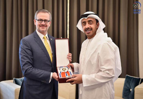 ABU DHABI, 16th January, 2017 (WAM)-- H.H. Sheikh Abdullah bin Zayed Al Nahyan, UAE Minister of Foreign Affairs and International Cooperation, has been awarded the President of Costa Rica's National Order of Juan Mora Fernandez by President Luis Guillermo Solis Rivera, in recognition of his efforts to expand bilateral relations between the two countries. He was presented with the recognition yesterday by Costa Rican Minister of Foreign Relations Manuel Antonio Gonzalez Sanz at a meeting held at the UAE Ministry of Affairs and International Cooperation in Abu Dhabi. The officials also discussed ways of promoting bilateral relations, along with issues of common concern for the two countries. Welcoming his Costa Rican counterpart, Sheikh Abdullah stressed the importance of friendship and mutual co-operation between the two countries. Gonzalez Sanz stressed that his country is keen to promote co-operation with the UAE and lauded its prestigious regional and international stature. . – Emirates News Agency, WAM - http://www.wam.ae/en/news/emirates/1395305930727.html