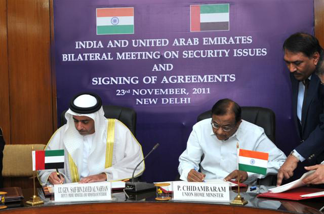 New Delhi - Nov 24, 2011 (WAM) - India and the United Arab Emirates (UAE) signed an important "Agreement on Security Cooperation" today, enhancing existing cooperation particularly against terrorism. The agreement was among the two pacts that the visiting H. H. Lt. General Sheikh Saif bin Zayed Al Nahyan, Deputy Prime Minister and Minister of Interior, signed with his Indian host, Home Minister P Chidambaram.