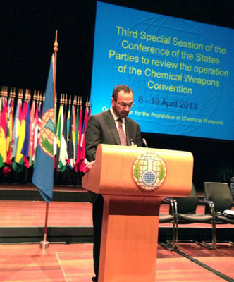 The Hague, April 10, 2013 (WAM) : UAE's Assistant Foreign Secretary for Military and Security Affairs Fares Mohamed Al Mazrouei has lauded the progress made in the implementation of the Chemical Weapons Convention (CWC) since the 2nd Review Conference. Addressing the 3rd Review Conference of the States Parties of the Chemical Weapons Convention, which opened yesterday in the Hague, Al Mazrouei said the CWC managed to monitor implementation national obligations in the state parties, including destruction of almost three fourth of the declared chemical weapon stocks. "This proves credibility and effectiveness of the convention, as well as its success in putting in place a verification system that would lead to disarmament of chemical weapons. He referred to the efforts to establish a Middle East zone free of all nuclear weapons and other weapons of mass destruction and regretted that the conference on that regard, could not be held in 2012. At the end of his speech, Al Mazrouei renewed UAE's commitment to the CWC, saying the country was in the process of issuing a national law on prohibition of chemical weapons. – Emirates News Agency, WAM