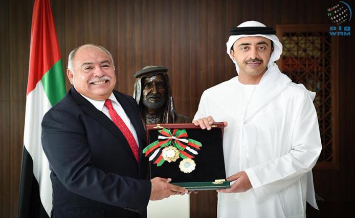 H.H. Sheikh Abdullah bin Zayed Al Nahyan, Minister of Foreign Affairs and International Cooperation, presented the Mexican ambassador with the order in his office at the Ministry yesterday.