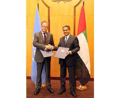 GENEVA: The United Arab Emirates (U.A.E.) has signed a Memorandum of Understanding (MoU) with the United Nations whereby U.A.E. will fund the maintenance of Hall No. 17 of the United Nations Office at Geneva (UNOG). According to the MoU, UNOG's Hall No. 17 will bear the name of the United Arab Emirates. The MoU was signed at a ceremony at UNOG by Ambassador Obaid Salem Al Zaabi, Permanent Representative of the United Arab Emirates to the United Nations in Geneva and other International Switzerland-based Organisations, and Michael Moller, Acting Head of the United Nations Office at Geneva (UNOG). – Emirates News Agency, WAM - http://www.wam.ae/en/news/emirates-international/1395268958485.html