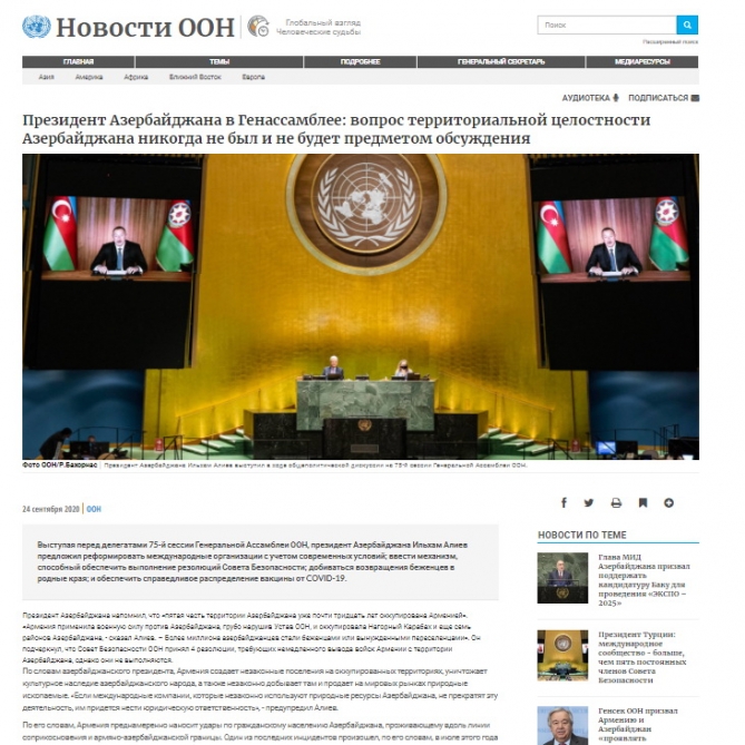 The United Nations news portal has published a special article highlighting Azerbaijani President Ilham Aliyev’s speech at the general debates of the 75th session of the UN General Assembly held in a video format, AZERTAC reports.