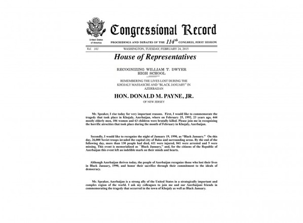 Congressman from New Jersey (USA) Donald Payne made a statement in the US Congress in connection with the 23rd anniversary of the Khojaly tragedy, Azertag state news agency reported.