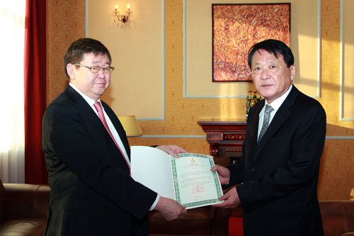 Ulaanbaatar /MONTSAME/ The Vice Minister for Foreign Affairs of Mongolia, Mr D.Gankhuyag has presented a title of Cultural Honorary Envoy of Mongolia to S.Korean citizen Kim Kwang Shin.