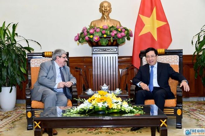 Hanoi, August 30 (VNA) – Vietnamese Deputy Foreign Minister Nguyen Quoc Dung and his Uruguayan counterpart Ariel Bergamino co-chaired a political consultation in Hanoi on August 29, which focused measures to promote the bilateral relations and cooperation between the two countries and foreign ministries. During the 3rd consultation at the deputy foreign ministerial level between Vietnam and Uruguay, the two sides agreed to continue their coordination in implementing commitments of the two countries’ leaders, enhancing the exchange of delegations and bilateral meetings, and promoting cooperation in agricultural, IT and science projects. They also agreed to maintain activities of the Vietnam-Uruguay Joint Committee on economic, trade and investment cooperation, and the political consultation mechanism between the two foreign ministries, and complete the legal framework for bilateral cooperation. The two sides discussed regional and international issues of shared concern, sharing their views that disputes between countries need to be settled by peaceful measures on the basis of international law. Later the same day, Deputy Foreign Minister Bergamino met with Deputy Prime Minister and Foreign Minister Pham Binh Minh, and had a working session with President of the Vietnam Union of Friendship Organisations Nguyen Phuong Nga. During his stay, Bergamino is scheduled to meet with Chairman of the Communist Party of Vietnam Central Committee’s Commission for External Relations Hoang Binh Quan, and key officials from the Ministry of Industry and Trade./.