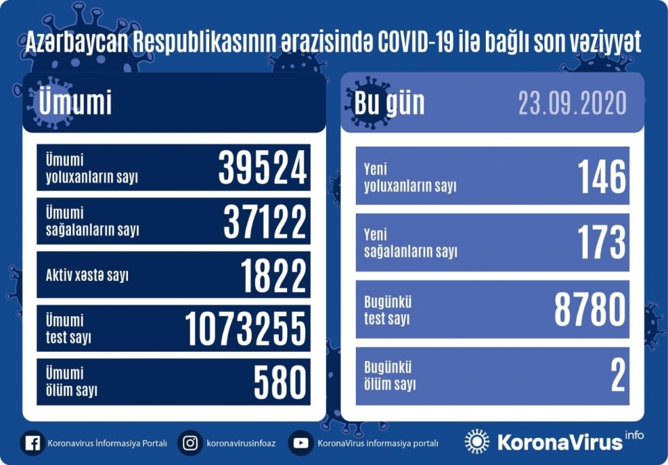 The Task Force under the Cabinet of Ministers of Azerbaijan said 173 more people recovered from COVID-19 in the last 24 hours, bringing the tally to 37,122 while another 146 people contracted the virus, bringing the total count of infections thus far to 39,524.