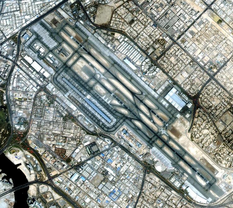 DubaiSat-2 of Emirates Institution of Advanced Science and Technology captured an image of the Dubai International Airport from outer space, characterised by high quality and a one meter resolution.