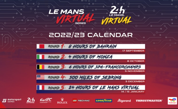 The rounds will be: Round 1: the 8 Hours of Bahrain, Bahrain, on September 17; Round 2: The 4 Hours of Monza, Italy, on October 8; Round 3: The 6 Hours of Spa, Belgium, on November 5; Round 4: The 500 Miles of Sebring, USA, on December 3; and Round 5: The 24 Hours of Le Mans Virtual on January 14/15, 2023.