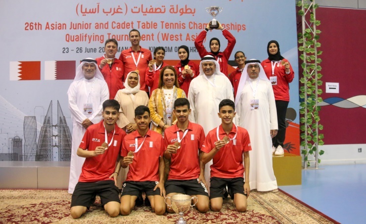 Manama, Jun 26 (BNA): Bahrain U-16 table tennis cadet teams shone in the West Asian qualifiers. The national squads topped the competitions, finishing first in both boys and girls’ categories. Bahrain Table Tennis Society Chairperson Shaikha Hayat bint Abdulaziz Al Khalifa attributed the honourable results to royal care of His Majesty King Hamad bin Isa Al-Khalifa, hailing the support of His Royal Highness Prince Salman bin Hamad Al-Khalifa, the Crown Prince and Prime Minister. “These outstanding results reflect strides achieved by national table tennis players in international competitions”, she said, praising the players for honouring Bahrain in external sports arenas. She commended the support of HM the King’s Representative for Humanitarian Work and Youth Affairs, Supreme Council for Youth and Sports (SCYS) Chairman His Highness Shaikh Nasser bin Hamad Al Khalifa, and SCYS First Deputy Chairman, General Sports Authority Chairman and Bahrain Olympic Committee President HH Shaikh Khalid bin Hamad Al-Khalifa. Shaikha Hayat bint Abdulaziz Al Khalifa also valued the sup;port of BOC Deputy President HH Shaikh Isa bin Ali bin Khalifa Al Khalifa, commending his presence at the final ceremony of the championship.