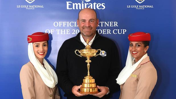 [Image caption: Emirates Cabin Crew and Thomas Bjørn, the European Ryder Cup Team Captain pose with The Ryder Cup. - Courtesy Emirates]