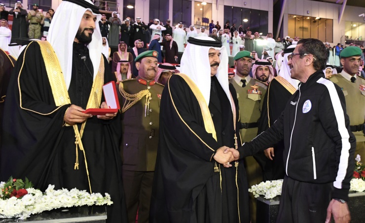 HM the King was accompanied by Representative of HM the King for Charity Works and Youth Affairs, Chairman of the Supreme Council for Youth and Sports, President of Bahrain Olympic Committee HH Shaikh Nasser bin Hamad Al Khalifa, and First Deputy Chairman of the Supreme Council for Youth and Sports, President of Bahrain Athletics Association HH Shaikh Khalid bin Hamad Al Khalifa.