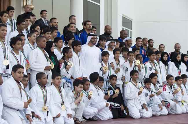 Abu Dhabi (WAM): His Highness General Sheikh Mohamed bin Zayed Al Nahyan, Crown Prince of Abu Dhabi and Deputy Supreme Commander of the UAE Armed Forces has received gold medal winners at the Abu Dhabi World Professional Jiu-Jitsu Championship which was held recently at the FGB Arena. The gold medalists were accompanied by Abdulmunem Al Hashemi, Chairman of the UAE Jiu-Jitsu Federation and President of the Asian Jiu-Jitsu Union. Sheikh Mohamed praised the performance of the UAE team which led them to collect 19 gold medals in the seniors and masters categories. He congratulated them on the achievement and urged them to strive for continuous improvement and to focus on the same time on their education. Sheikh Mohamed also commended the efforts mad by the UAE Jiu-Jitsu Federation to promote the game within the country and the excellent organisation of the championship. He also thanked the championship's sponsoring organisations. The meeting with Sheikh Mohamed was a special reward for the champions who expressed pleasure and pledged to develop their skills and to work hard to win more medals for the UAE in international competitions. – Emirates News Agency, WAM