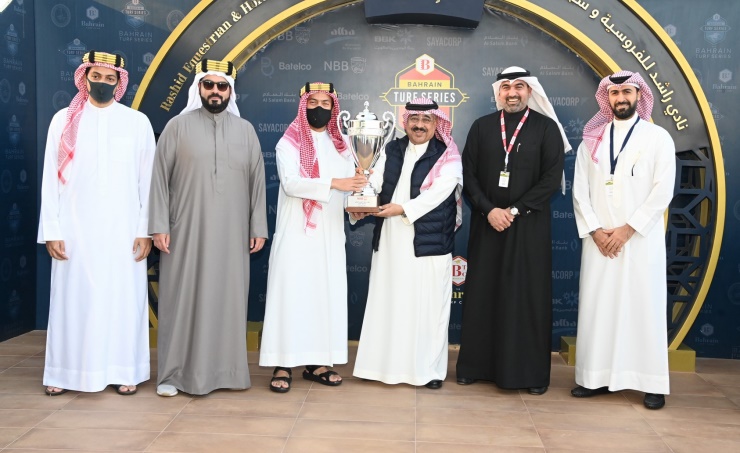 NBB’s Chief Executive Officer for Strategic Accounts, Abdulaziz Al-Ahmed, presented the trophies of the sixth and seventh rounds to HH Shaikh Hashim bin Mohammed bin Salman Al Khalifa, the trophy of the third round to HH Shaikh Khalid bin Ali bin Isa Al Khalifa, and the trophy of the first round to winning trainer, Yousif Al-Buainain.