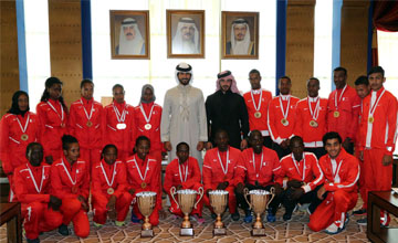 HH Shaikh Khalid bin Hamad Al Khalifa presented members of winning national team in the 13th Asian Cross-country Championship which was held in the Kingdom. Abdulrahman Askar, General Secretary of Bahrain Olympic Committee also attended the meeting.