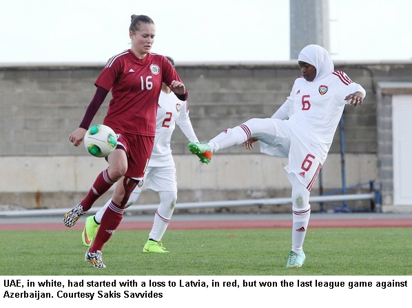 ABU DHABI, 18th March, 2015 (WAM) -- The UAE women’s football team faced Azerbaijan yesterday in a play-off for fifth place at the Aphrodite Cyprus Cup after recording their first win of the tournament, beating Lebanon by three goals to nil on Sunday. Nouf Saleh, Shahad Jassem and Salha Rashid scored one each as the UAE finished the group stage on a consolatory note after two prior losses, 2-0 to Latvia and 7-0 to Greece. Greece and Cyprus will now face off for first place, Latvia and Malta for third place and Bahrain and Lebanon will compete for seventh place. Maryam Bertawi, one of the players, said that the UAE had benefited a lot from the three matches in the Cyprus international tournament, including the game against Lebanon, in which the UAE team scored a morale-boosting win. "We played well against Lebanon, we controlled the game and we learnt from our mistakes in the first two matches against Latvia and Greece," she said. Nora Mazrouei, the captain and goalkeeper, said she was happy with the level shown by her side and said that playing in competitive international competitions such as the Cyprus tournament could benefit the UAE team. "We followed the coach’s instructions on the pitch, which helped us to win," she said. "The Lebanese team was not weak, it was rather a strong competitor. But we were determined to achieve a positive result after the losses against Latvia and Greece." This was the team’s first outing after being absent from competitions for more than 18 months. Participating in the tournament means the UAE will now enter the Fifa world rankings and be able to play a wider range of competitions. http://www.wam.ae/en/news/sports/1395278035072.html