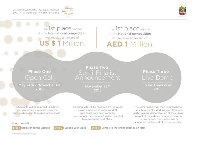 DUBAI, 7th June 2015 (WAM) --- The Organising Committee of the first edition of the US$ 1 million ‘UAE AI & Robotics Award for Good’ has announced that it will start receiving submissions for the award from 7 June, 2015. The award, which is open to individuals, teams, universities and companies from around the world, also offers Dh 1 million for the winner at the national level. The winners will be honoured at a special ceremony in February 2016 before the fourth Government Summit. The ‘UAE AI & Robotics Award for Good’ aims to encourage research and applications of innovative solutions in artificial intelligence and robotics to meet existing challenges in three key categories: health, education and social services. It also aims to promote public awareness about the positive opportunities offered by these applications, and turn the innovative ideas into reality to develop services provided by the UAE Government. On this occasion, H.H. Sheikh Hamdan bin Mohammed bin Rashid Al Maktoum, Crown Prince of Dubai, said the UAE looks to artificial intelligence and robotics as a strategic and promising sector in view of the economic and scientific opportunities it holds, and its importance as one of the key areas of research and development in the biggest economies of the world. His Highness said the ‘UAE AI & Robotics Award for Good’ is one of the main initiatives that supports innovation in this advanced sector, and is part of the commitment to implement the targets of the National Innovation Strategy launched by Vice President and Prime Minister and Ruler of Dubai, His Highness Sheikh Mohammed bin Rashid Al Maktoum, to make the UAE one of the most innovative countries in the world by the year 2021. H.H. Sheikh Hamdan said the award offers the first of its kind global platform for innovation, focusing on the practical side of this technology in areas of much relevance to the society such as health, education and social services. His Highness said the Award will play an integral role along with other government initiatives in the field of robotics, such as the Mohammed Bin Zayed International Robotics Challenge (MBZIRC) which was launched last February under the patronage of His Highness Sheikh Mohamed bin Zayed Al Nahyan, Crown Prince of Abu Dhabi and Deputy Supreme Commander of the UAE Armed Forces. "We expect that the national universities will play a major role in the success of this global event by encouraging students to be involved in research and development, and compete with the most advanced universities and research institutions in the world," His Highness said. Such competitions will help share experiences and raise the level of innovation, particularly in the student community, His Highness said. The Award will continue to receive submissions in the International and National competitions until November 1, 2015. Those interested in participating can register through the Award website (www.roboticsforgood.ae) along with submissions of their videos and proposals. The proposals will be reviewed by a judging panel of global experts following which 10 applicants from each category in the International and National competitions will be selected for the next round which will be announced on November 22, 2015. The semi-finalists will then be brought to Dubai to present a working prototype and give a live demonstration of their ideas in front of the panel of judges, which includes high-profile experts and specialists in artificial intelligence and robots technologies. The members of the panel of judges will be announced at a later date. Applicants must be able to demonstrate a working prototype for the final stage of the competition, offering a genuine service or solution to a real human need. They should suggest new ways of improving an existing service using robotics and artificial intelligence, or offer new kinds of services that could be implemented practically and economically through these technologies. In addition, the projects should be semi- or fully autonomous, as well innovative, futuristic and use the most advanced civilian technology available. They should also be safe, effective and economical. Individuals, teams, universities and companies are eligible to participate in both the National and International competitions. UAE citizens and residents may choose to participate in either the National Competition or the International Competition, while contestants who are not UAE citizens or residents are eligible to participate only in the International Competition. The ‘UAE AI & Robotics Award for Good’ was launched by H.H. Sheikh Hamdan during the third Government Summit in February 2015, as one of the initiatives of International Council on Artificial Intelligence and Robotics, which was formed in collaboration with the World Economic Forum during Global Agenda Council hosted by the UAE Government last year. The Council includes thought leaders from the largest universities and the most important companies and institutions around the world. It aims to offer advice on the best ways to use robots and artificial intelligence to improve human life and work on a global strategy for the use of robots in several key sectors. – Emirates News Agency, WAM – http://www.wam.ae/en/news/emirates/1395281526411.html