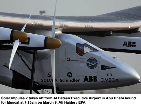 Solar Impulse launches "The Future is Clean" initiative; takes off from Abu Dhabi for first leg of its round-the-world flight