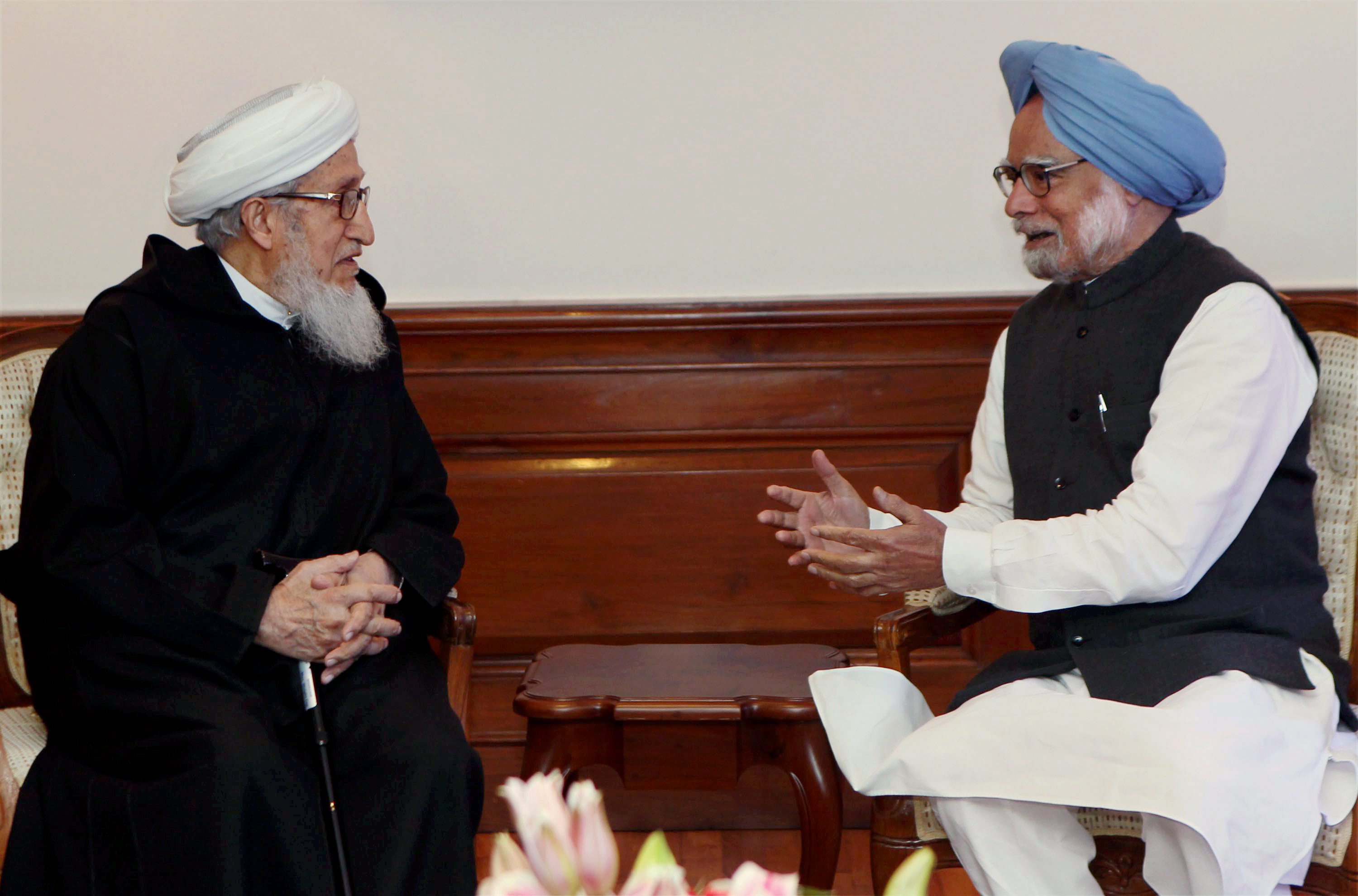 India's Prime Minister Manmohan Singh with former Afghanistan President Sibghatullah Al-Mojaddedi during a meeting in New Delhi on Tuesday. PTI Photo