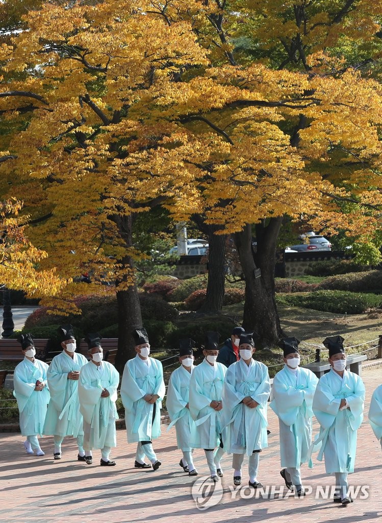 Confucian scholars wearing a traditional men's outfit, called "dopo" in Korean, attend an annual ritual at Ojukheon, a traditional house that shows the lifestyle of people during the Joseon Dynasty (1392-1910), in Gangneung on South Korea's east coast on Oct. 26, 2021, to pay tribute to Yi Yul-gok (1536-1584), a well-known Korean Confucian scholar. Ojukheon is the house of Shin Saimdang (1504-1551), who raised the scholar. (Yonhap)