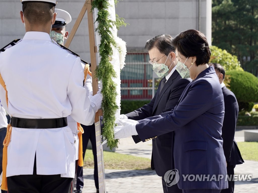 President Moon Jae-in and his wife, Kim Jung-sook, offer flowers in front of a monument for the victims of a marine helicopter crash at the Marine Corps' First Division in Pohang, 374 kilometers southeast of Seoul, on Oct. 1, 2021, the 73rd Armed Forces Day. The MUH-1 helicopter, or Marineon, crashed at a military airport in Pohang in July 2018, killing five of the six Marines aboard and injuring the other. (Yonhap)