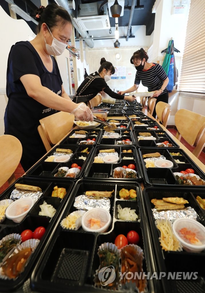 Employees make boxed lunches for delivery at a restaurant near the government complex in Sejong, central South Korea, on Aug. 31, 2020, as many people tend to eat lunch while avoiding close contact with other people amid the coronavirus pandemic. (Yonhap)