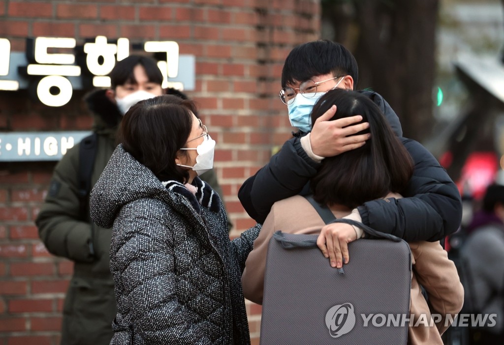 A father encourages his child at the gate of a high school in Seoul as the student enters the school to take the college entrance exam on Dec. 3, 2020. (Yonhap)